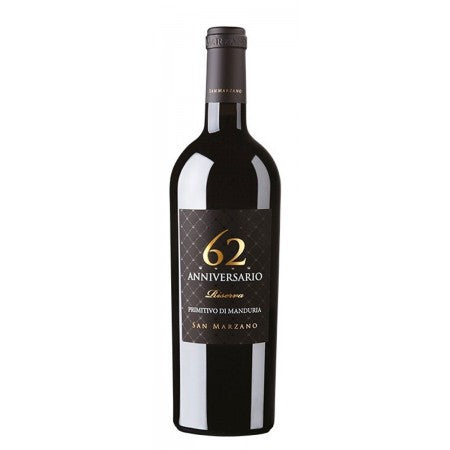 The San Marzano Primitivo Di Manduria Anniversario 62 Riserva 2019 750 ML is a luxurious Italian red wine crafted from old-vine Primitivo in Puglia. The San Marzano Primitivo Di Manduria Anniversario 62 Riserva 2019 750 ML opens with intense aromas of ripe blackberry, plum, and dark cherry, layered with sweet spices, vanilla, and cocoa. On the palate, the San Marzano Primitivo Di Manduria Anniversario 62 Riserva 2019 750 ML delivers full-bodied richness, velvety tannins, and flavors of dried figs, licorice, and toasted oak. The San Marzano Primitivo Di Manduria Anniversario 62 Riserva 2019 750 ML offers remarkable depth and a long, smooth finish, making it ideal for pairing with roasted meats, rich pasta dishes, or aged cheeses. Experience the elegance, complexity, and power of San Marzano Primitivo Di Manduria Anniversario 62 Riserva 2019 750 ML in every glass.San Marzano Primitivo Di Manduria Anniversario 62 Riserva 2019