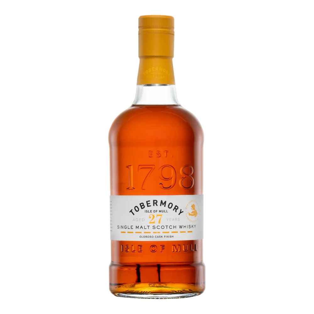 Crafted on the Isle of Mull, Tobermory Single Malt Scotch Oloroso Cask Finish 27 Yr celebrates tradition, depth, and purity. This exceptional Tobermory Single Malt Scotch Oloroso Cask Finish 27 Yr shows unmatched smoothness and power at natural cask strength. The sherry cask influence provides notes of fig, caramel, nutmeg, and roasted almond, creating a bold but balanced finish. Whether enjoyed neat or shared among connoisseurs, Tobermory Single Malt Scotch Oloroso Cask Finish 27 Yr represents Scottish craftsmanship at its highest level.